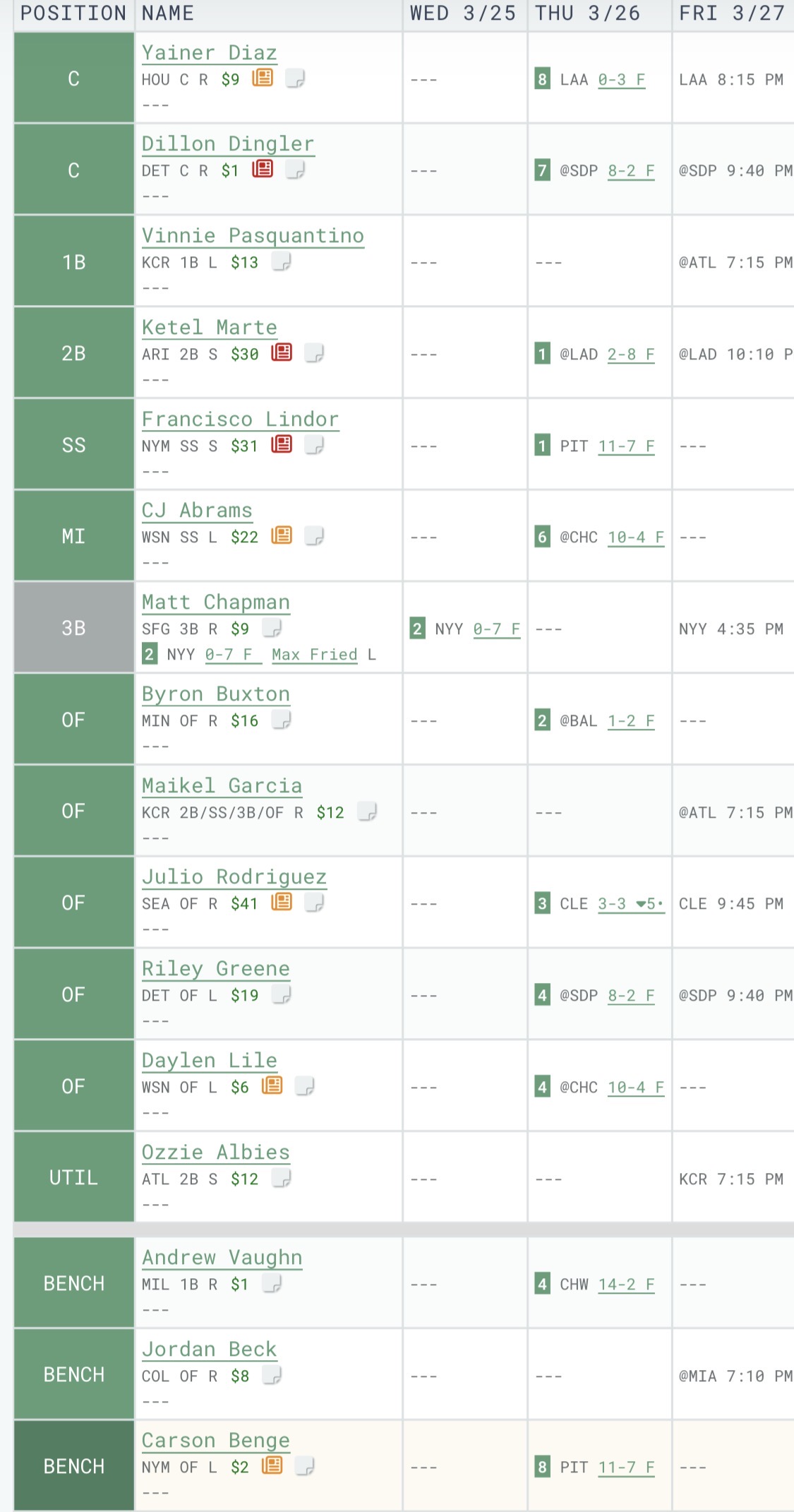 If anyone in a weekly league runs into an issue with this, they should email me, but the Braves and Royals don’t play for another 7 hours so I think there’s time to get everything sorted.